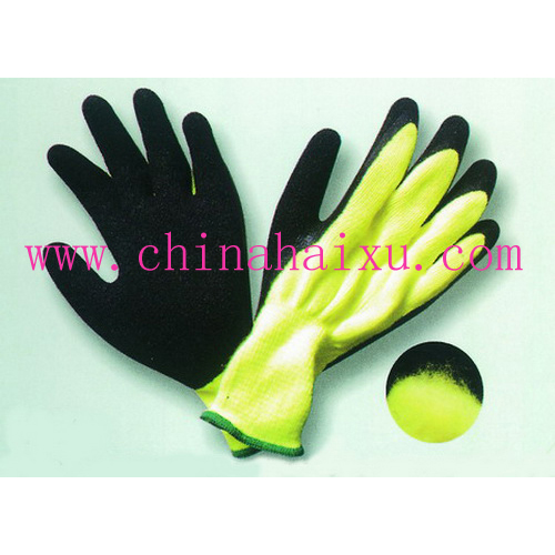 描述 10针荧光黄纱拉绒拇指全浸黑色天然乳胶,起皱处理